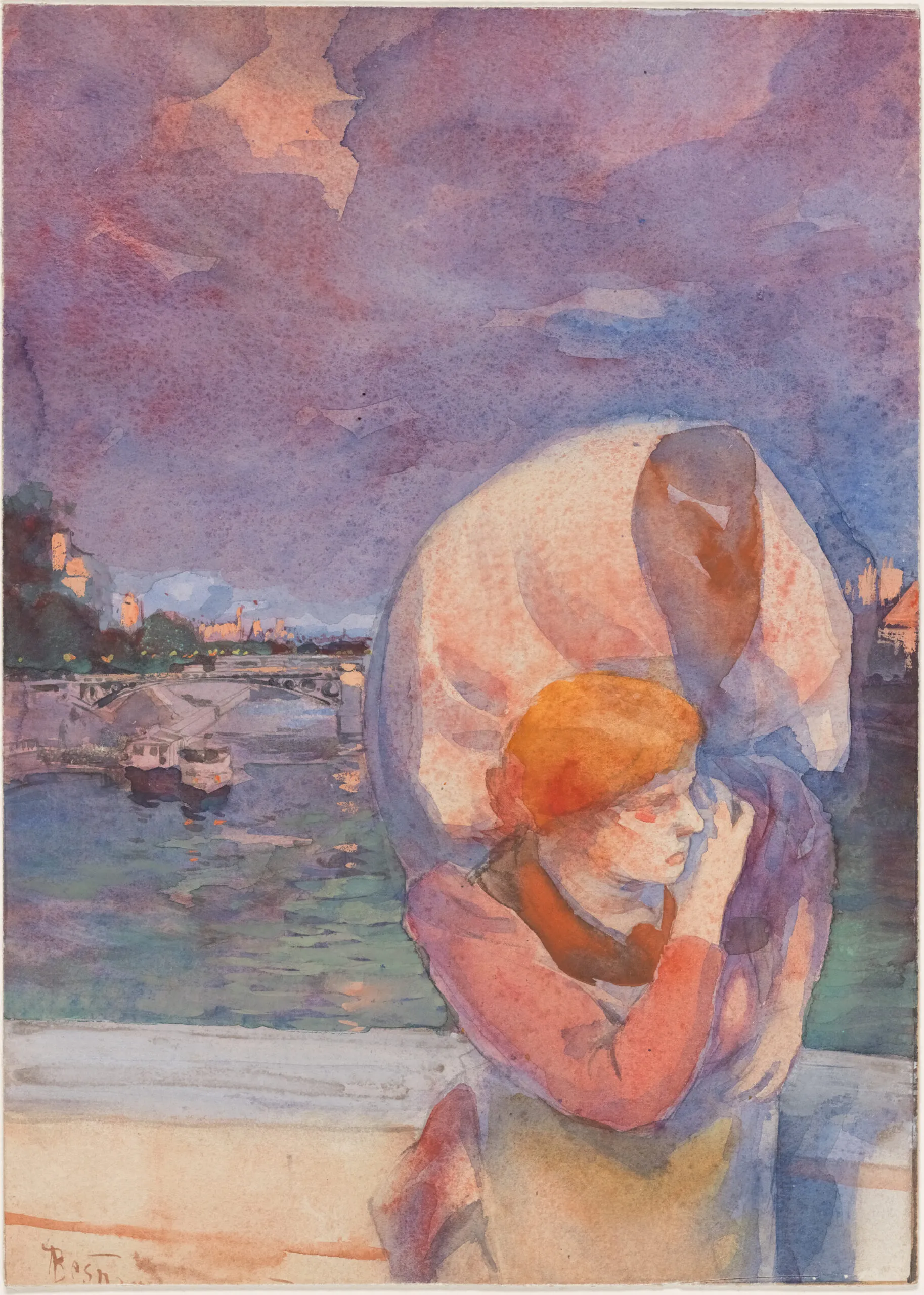 Crossing the Bridge shows a laundress walking across a bridge, illuminated by a soft, radiant glow. Albert’s creative use of color captures a dreamy, peaceful feeling. On the surface, it looks like a beautiful moment of everyday life. However, beneath the delicate colors of this backdrop there are remnants of a less-than-ideal truth. We can imagine the heavy bundle on her back and the hard work that fills her day. If you’re unfamiliar with the lives of laundresses, look at the September 2025