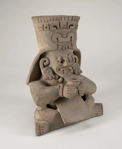 In this clay burial vessel, a figure sits cross-legged with his elbows on his knees, holding a water cup called an olla (OY-ya) between his hands. On his head rests a large headdress adorned with a Zapotec symbol identifying him as Cocijo, the god of lightning and rain. He wears an elaborate mask, which covers his nose and curves around the lines of his mouth. Large, ornate earrings hang from his ears, and a hood hangs down from the back of the headdress, curving around the tops of his ears. Vessels like this were included in ancient Zapotec burial chambers to demonstrate the continuation of life’s cycle after death.