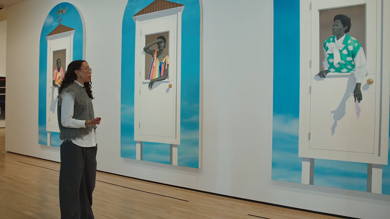 Amy Sherald’s striking triptych Ecclesia (The Meeting of Inheritance and Horizons) greets visitors at the entrance to Amy Sherald: American Sublime. Inspired by a scene from Wes Anderson’s film The Grand Budapest Hotel, the work unfolds across three panels, each telling a distinct story. Sherald invites viewers to imagine their own narrative: What is happening here? What are these subjects looking at and where might they be?