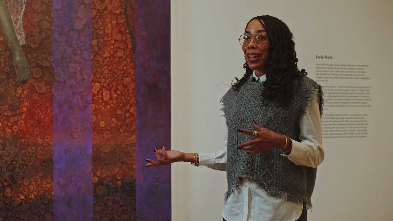 Hangman is the earliest painting featured in Amy Sherald: American Sublime. Created in 2007 during Sherald’s time at the Maryland Institute College of Art and featuring a Baltimore-based model, this work offers an early glimpse into the artist’s developing practice. Watch as Sherald reflects on this formative period and explains how Hangman contributed to the development of her now-signature use of grayscale skin tones.