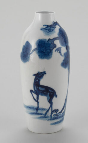 This vase features symbols of longevity: a pine, a deer, and a fungus. The pine tree is a Confucian symbol of endurance and a Daoist symbol of long life. The deer, another Daoist emblem of long life, possesses the ability to find the lingzhi fungus of immortality, which grows here beneath the pine. Considered with 1931.20.72-73, the three vases show that some porcelain decorators followed patterns yet added their own variations. A crane, another Daoist longevity symbol, appears on one. On the others, bats swoop downward carrying the message “happiness descends from heaven,” since the words for bat and happiness share the same sound. Look also at how the deer and trees were painted, as well as the presence or absence of landscape features like rocks.