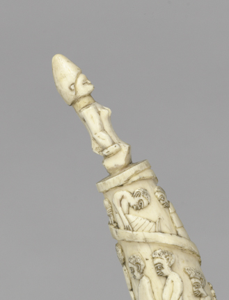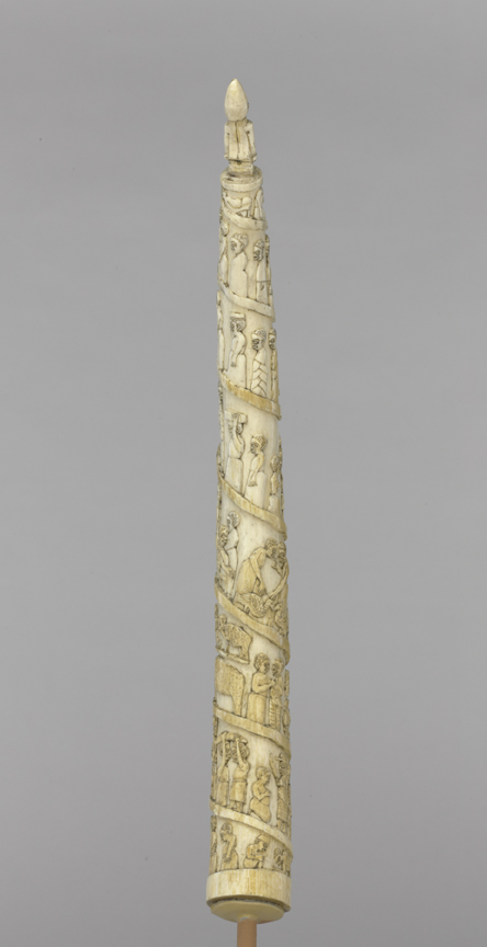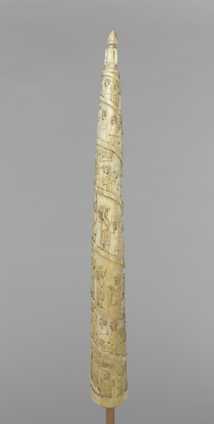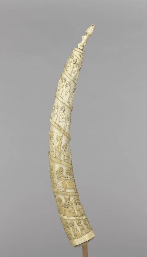 Look closely, and you will see scenes of 19th-century life in the Kingdom of Kongo carved into this tusk. People greet each other on the street. Porters carry heavy boxes and ivory tusks. Monkeys laugh. Since 1483, when Portuguese sailors first arrived in the region, the Kingdom of Kongo served as an important trading partner for European nations. Between 1850 and 1910, Kongolese artists memorialized these scenes on carved tusks created for European traders.
