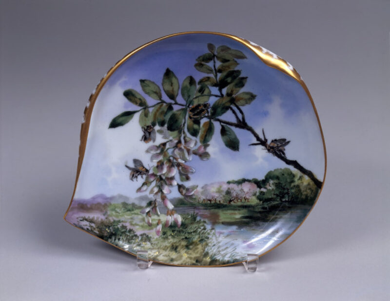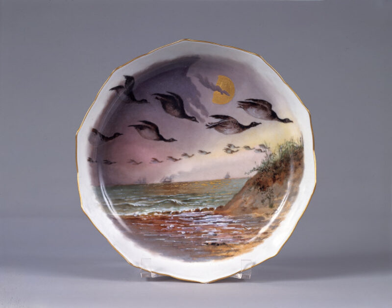 These plates are decorated with native birds, animals, and plants representing habitats across the United States. They were designed for the White House during the presidency of Rutherford B. Hayes (1822-1893). Guided by watercolor images of American flora and fauna by artist-illustrator Theodore Davis, French ceramicists painted and gilded each piece by hand. Produced just after the American Civil War (1861-1865), Davis’ representation of both northern and southern species symbolically united the recently divided nation on the president’s dining table and through rare copies, such as most of these examples, made for private households.