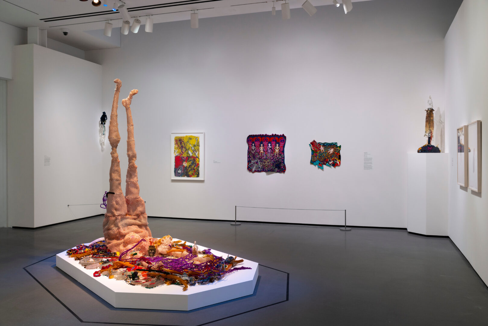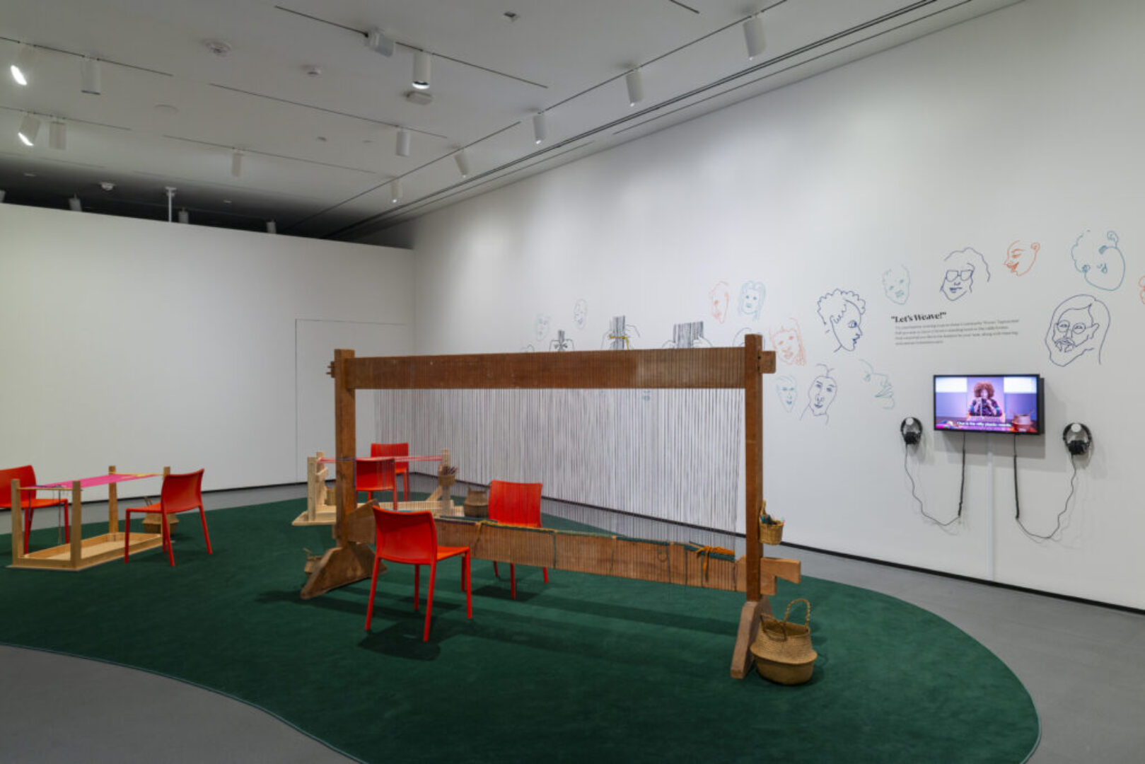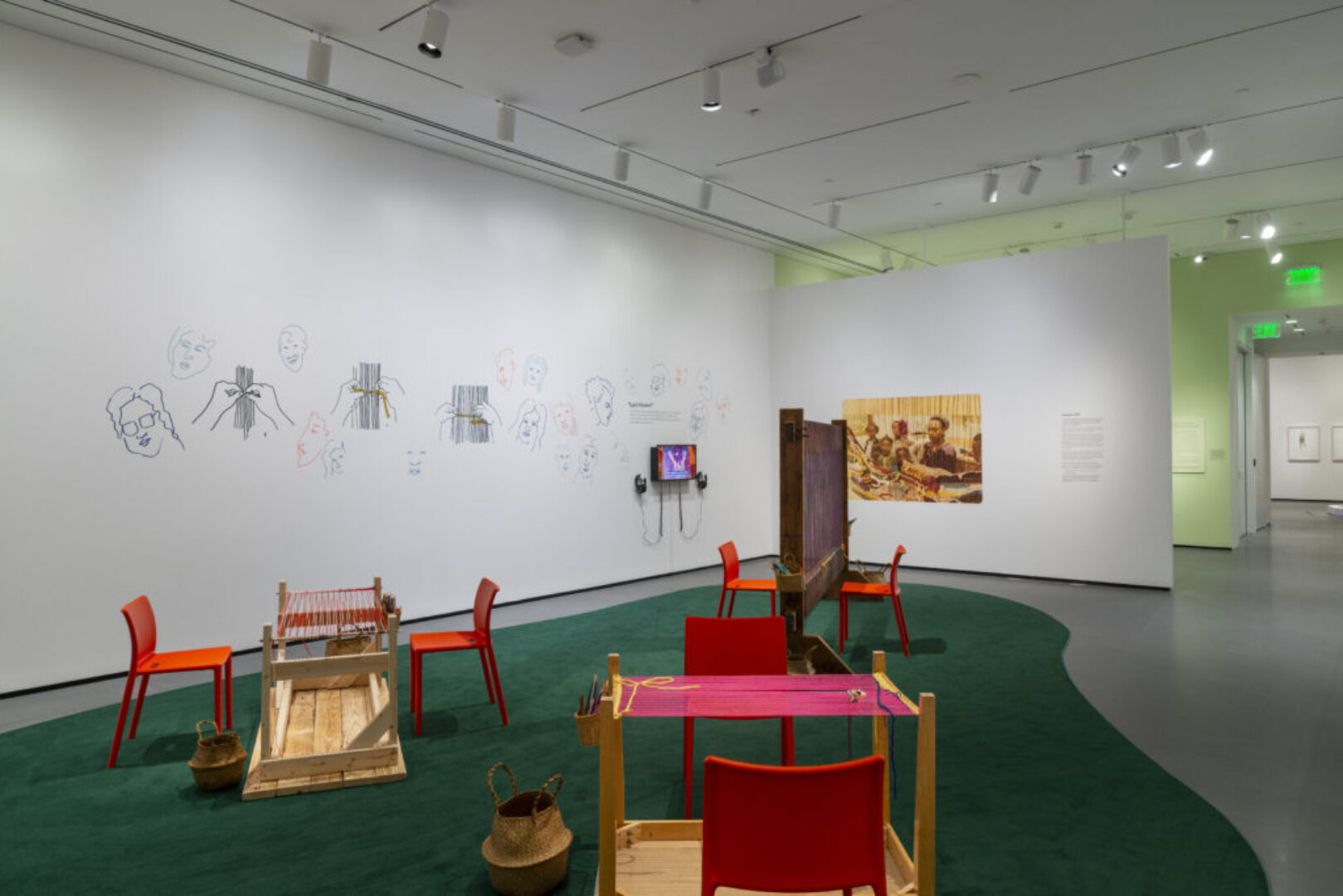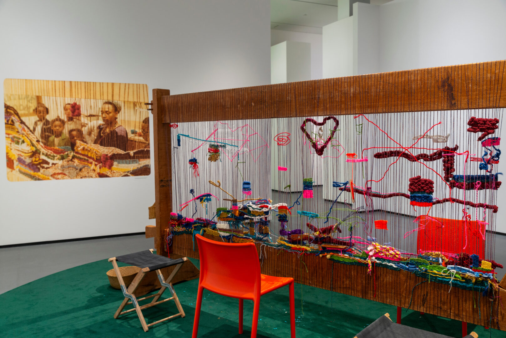 The exhibition also features a participatory weaving and storytelling environment, conceived by the artist as a hub for structured and informal programming. An expansive scholarly catalog accompanies the exhibition.