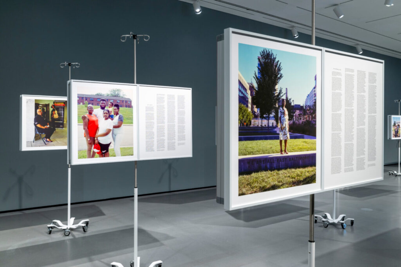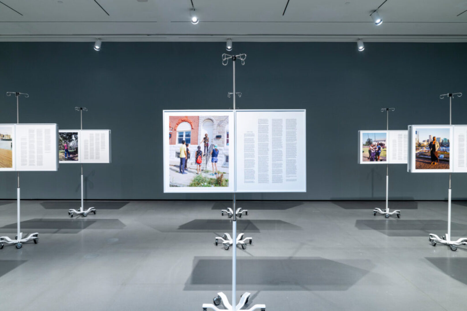 Initially created for the 58th Carnegie International, where it won the Carnegie Prize, the installation features a series of portraits and related narratives mounted on 18 socially distanced, stainless-steel IV poles that capture and celebrate the essential work of community health workers in Baltimore during the rollout of the COVID-19 vaccine. Powerful and deeply evocative, the large-scale installation monumentalizes the community health workers’ efforts and offers an alternative approach to monument-making that challenges us to consider the nature of how and who we honor.