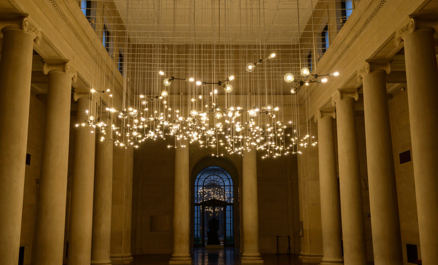Spencer Finch’s impressive light installation Moon Dust (Apollo 17), first presented at the 2009 Venice Biennale, will illuminate the BMA’s majestic Fox Court for the next seven years. The work consists of 150 individual chandeliers with 417 lights. The chandeliers are hung individually from the ceiling and form one large, cloud-like structure. Although an abstract sculpture, the installation is also a scientifically precise representation of the chemical composition of moon dust as it was gathered during the Apollo 17 mission. Finch translated the diagrams of the chemical formulas of the contained molecules by using light bulbs in different diameters and basic customary fixtures with different arm lengths to create a three-dimensional scale model of the moon’s atomic makeup. The diameter of a globe corresponds to the size of an atom and thus represents a specific element, the small globes representing helium, the bigger oxygen. The overall effect is one of science translated into visual wonderment.